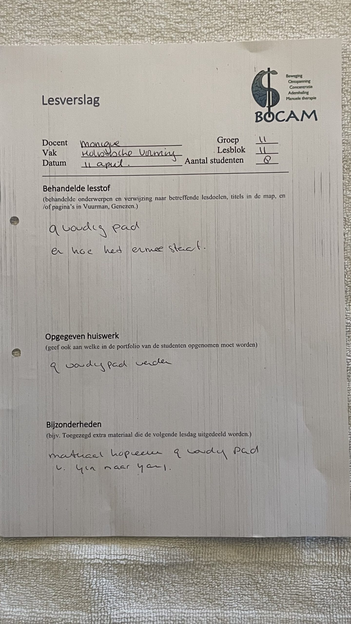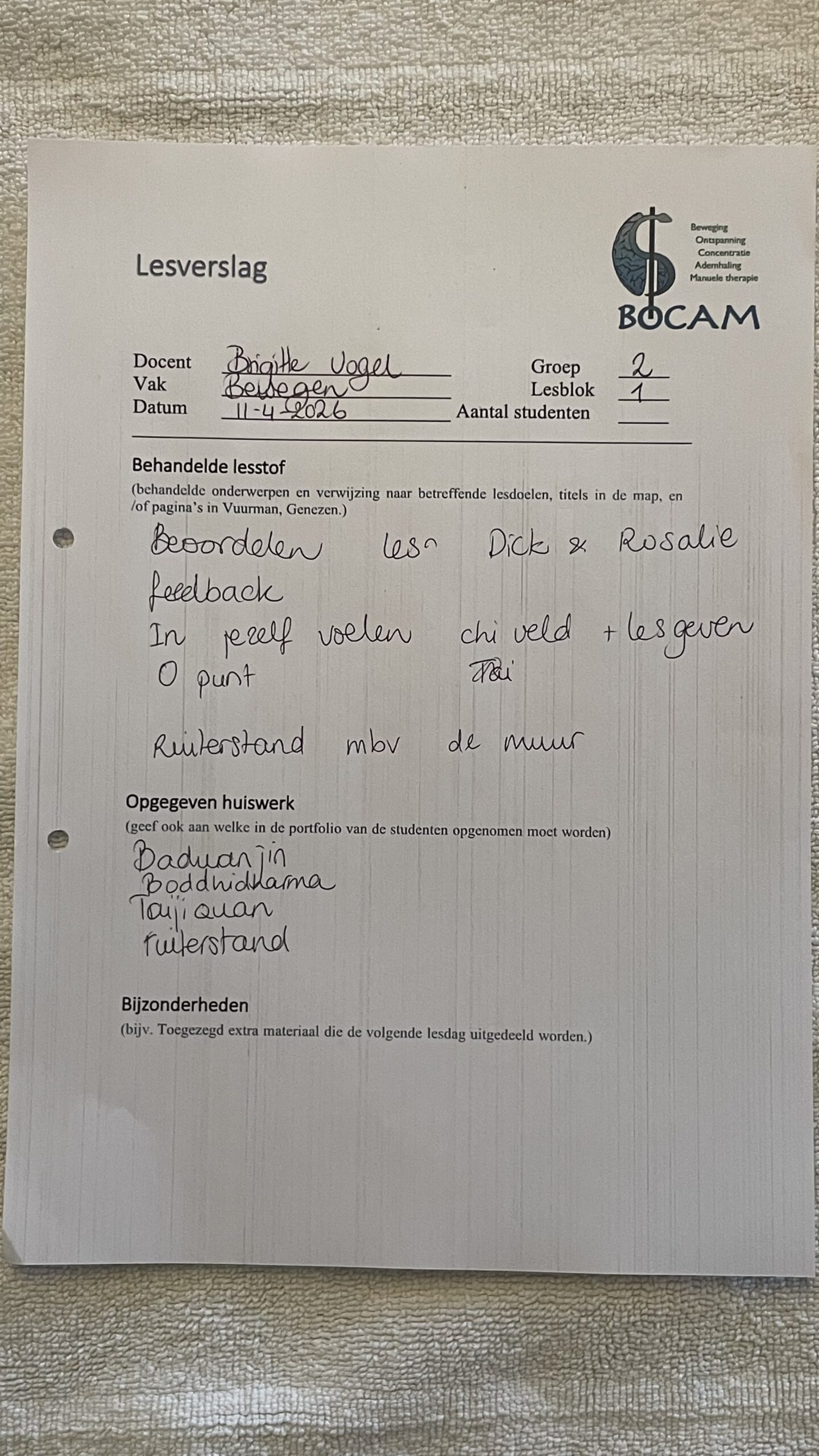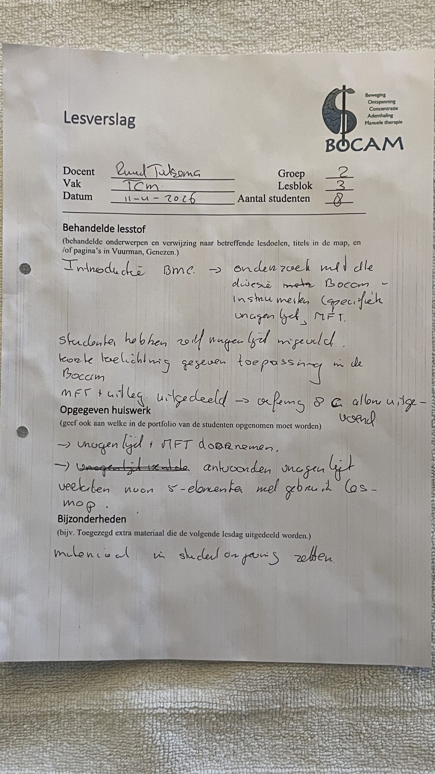 Lesverslag BOCAM 2e jaars 11 April 2026door prod_bocamin Lesverslagen BOCAM 2e Jaar 2025-2026on Geplaatst op 12 april 202612 april 2026 Bijgaand de lesverslagen: LV Bewegen : 2e jaars 11 April 2026Downloaden LV Holistische vorming: 2e jaars 11 April 2026Downloaden LV TCM : 2e jaars 11 April 2026Downloaden