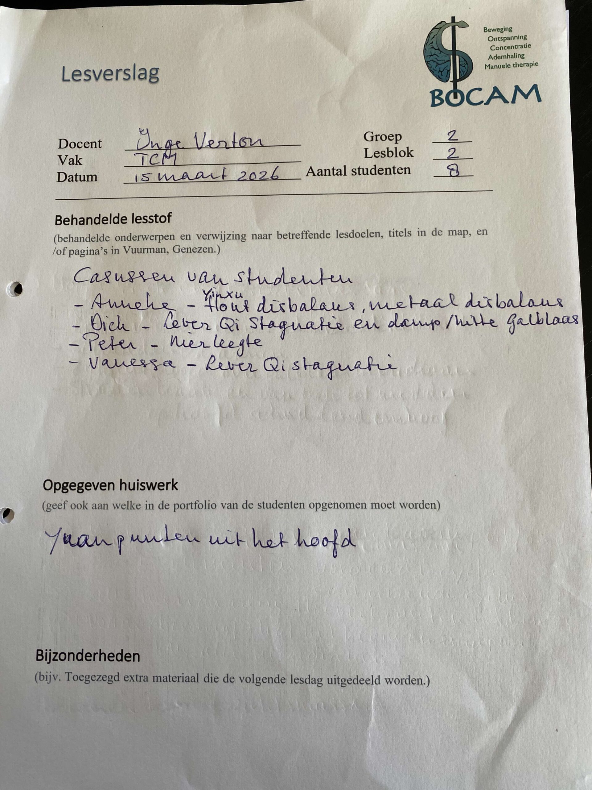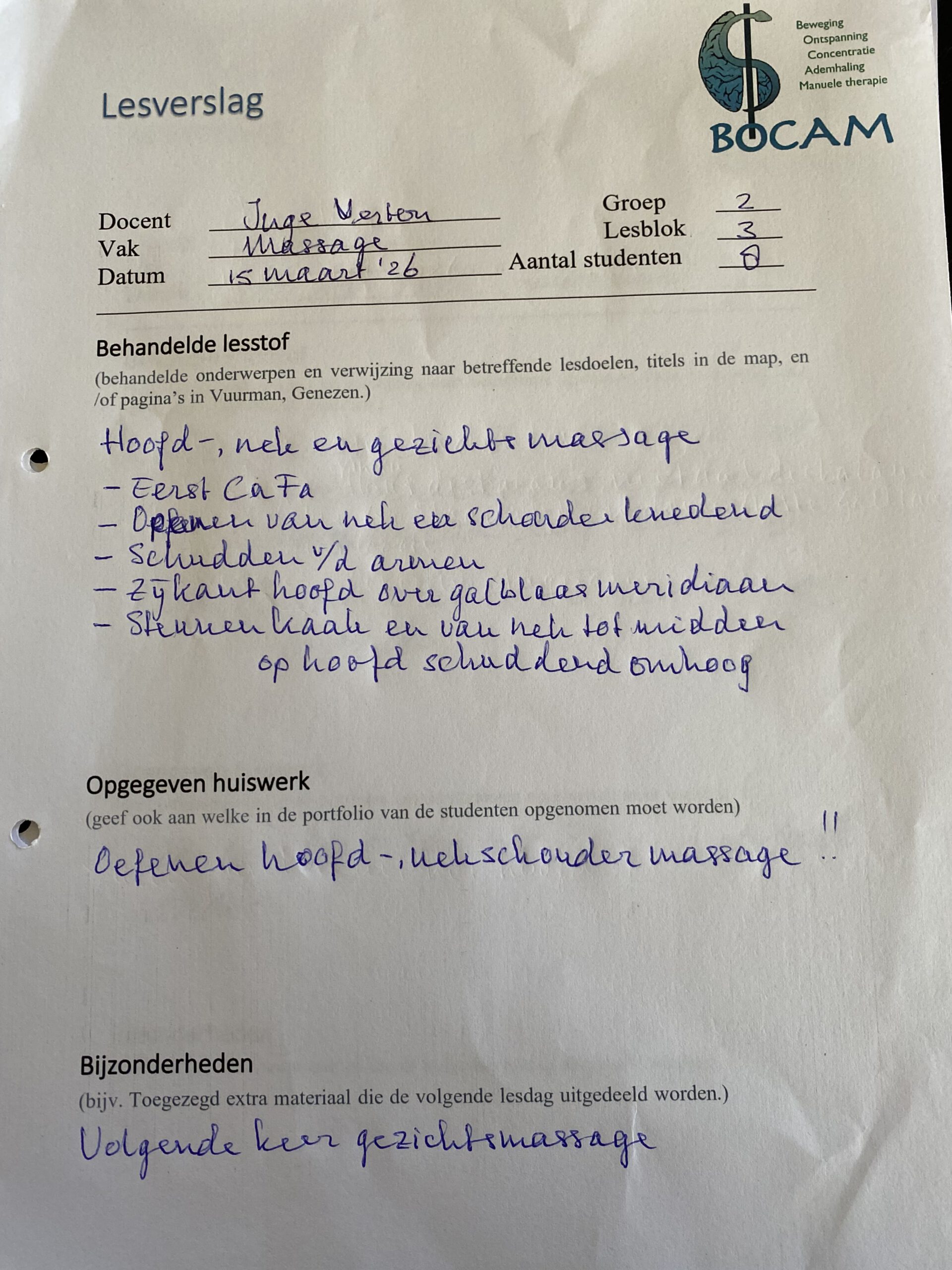 Lesverslag BOCAM 2e jaars 15 Maart 2026door prod_bocamin Lesverslagen BOCAM 2e Jaar 2025-2026on Geplaatst op 16 maart 202616 maart 2026 Bijgaand de lesverslagen: LV Bewegen: 2e jaars 15 Maart 2026Downloaden LV-TCM-Acu-2e-jaars-15-Maart-2026 kopieDownloaden LV Massage : 2e jaars 15 Maart 2026.pdfDownloaden